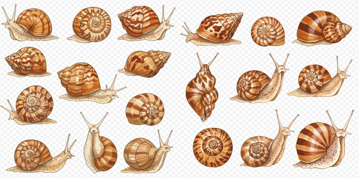 A collection of various garden snails with detailed brown and striped shells, depicted from multiple angles and perspectives.