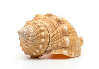 Spiral gastropod seashell displays intricate natural texture against a bright background