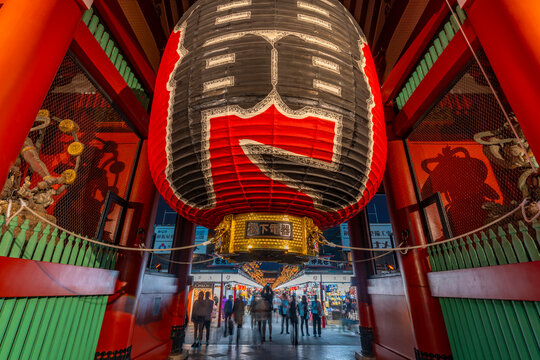 View of Kaminarimon Gate, entrance to Senso-ji Temple at night, Asakusa, Taito City, Tokyo, Honshu, Japan