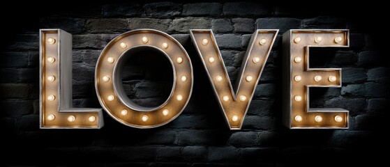 Large marquee light sign spelling love on a dark brick wall, suitable for decoration or celebration during Valentine's Day events and gatherings