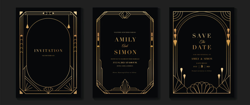 Set of vector art deco, gatsby golden covers. Trendy graphic poster, brochure, design, packaging, branding. Geometric shapes, ornaments, elements.