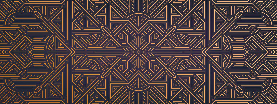 Vector art deco line floral leaf pattern. Japanese garden tree, luxury plant design, golden on white. Graphic print foliage decor