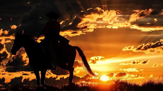 Silhouette of horse and gaucho family at sunset in the countryside.