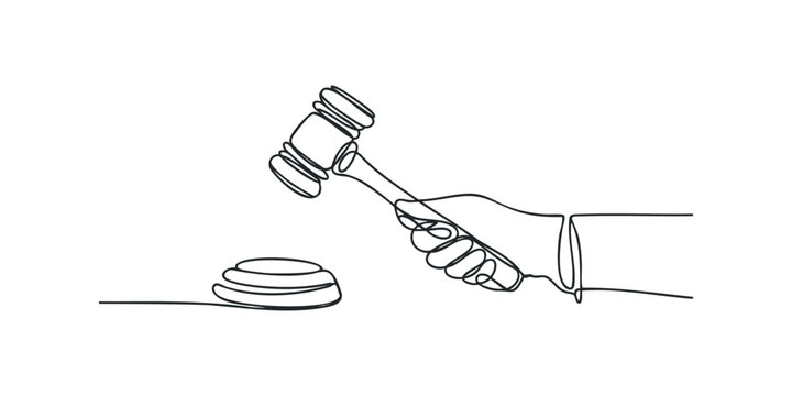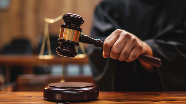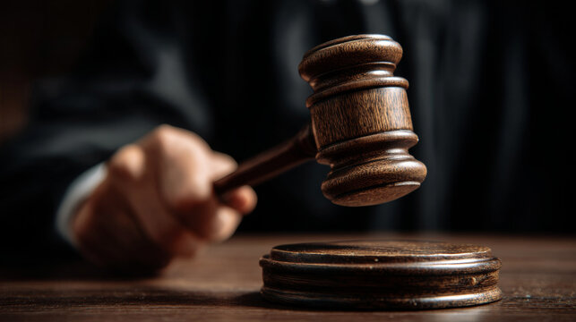 Judge's hand holding a dark wooden gavel with a golden band poised above a sound block to bring down the ruling during a solemn court hearing or legal proceeding symbolizing justice and authority