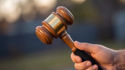 Human hand holding a wooden judge's gavel with a brass band