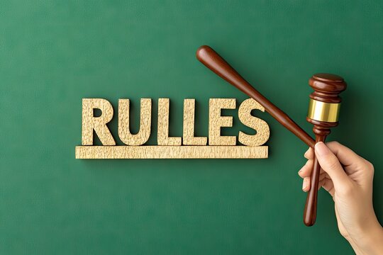 A hand holding a gavel about to strike next to a paper labeled rules, illustration of decisions on establishing rules applicable in business