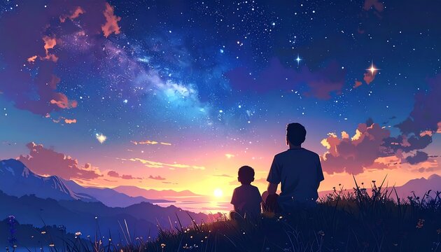 Father and Child Gazing at a Beautiful Sunset Together.