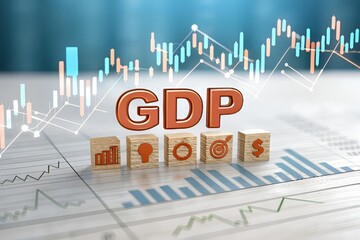 A conceptual art piece showing GDP trends as waves rising and falling against a backdrop of national flags, representing the ebb and flow of global economic power