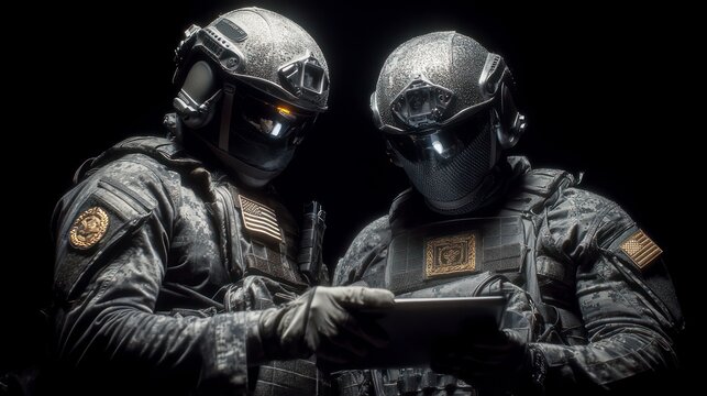 Two soldiers in tactical gear and helmets review a tablet focused and prepared