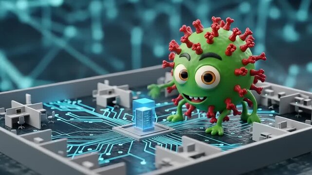 wavy background with digital pixels, circuit board patterns and colorful icons symbolizing innovation and progress