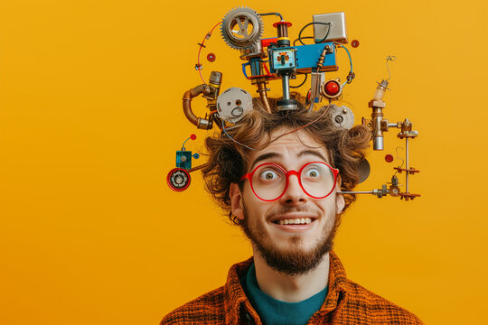 Crazy inventor full of strange inventions, copy space of a nerd with creative devices coming out of his head on a yellow background