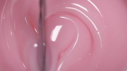 The spatula stirs the thick gel nail polish of light pink color, close-up