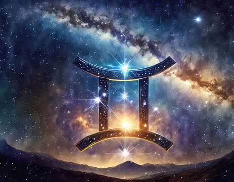 Gemini zodiac sign on starry night sky. Collection of astrology symbols. Photo collage