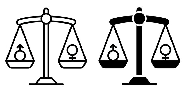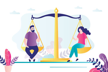 Female and male characters balancing on big scales. Equal rights for both sexes. Equality between man and woman