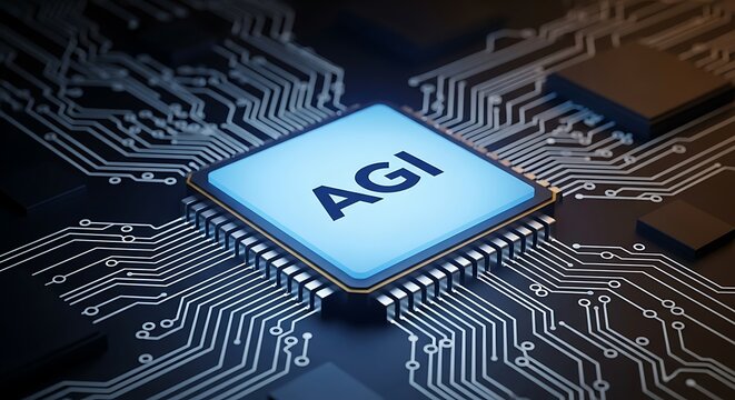 Close-up view of a computer chip with the letters AGI illuminated, highlighting artificial general intelligence technology.