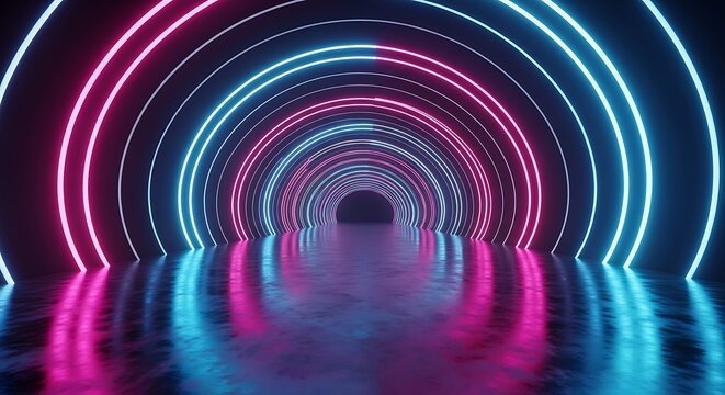 Abstract neon glowing circles creating a tunnel effect with reflective surface generating modern and futuristic