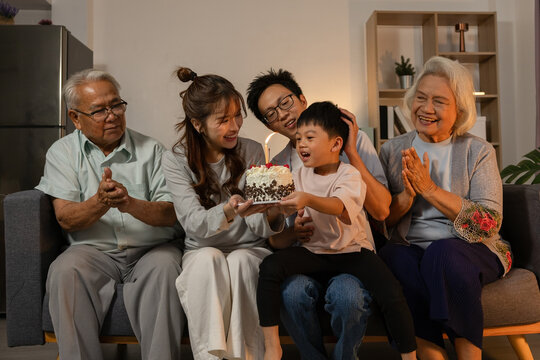 Happy multi generational Asian family celebrating birthday party with cake and sitting on sofa living room home while grandparents clapping hands with joyful smile bonding together