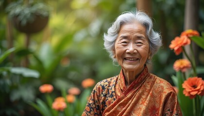 Elderly Southeast Asian woman with grey hair smiles in lush garden with orange flowers. She wears traditional patterned orange dress. Happy mature female relaxes in vibrant plants.