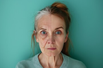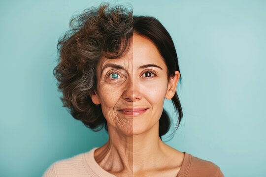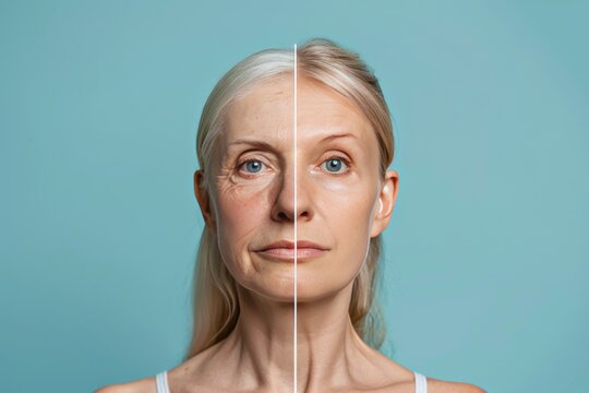 Aging treatment intervention and process in skincare techniques highlight visual aging and age split visual in facial comparisons.