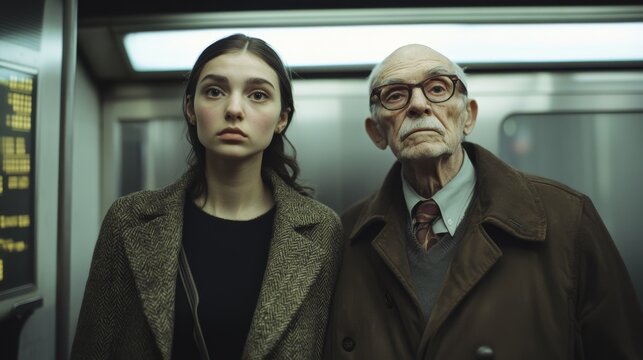A young woman and an elderly man stand thoughtfully in an elevator, each lost in contemplation, highlighting generational contrast and introspection.