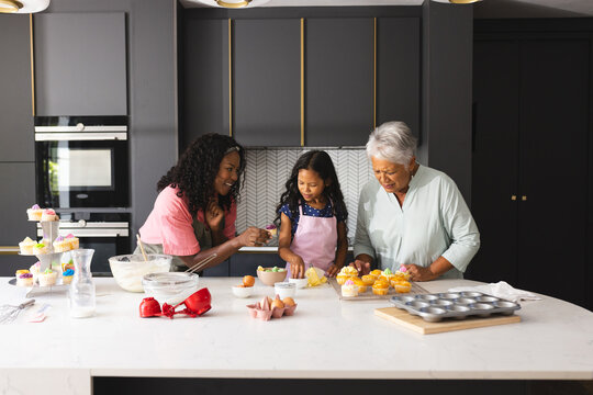 Grandmother, mother and daughter cooking together in bright modern kitchen. Three generations bonding while making dough, sharing family recipes and creating memories.