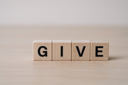 Wooden Blocks Spelling Give on Tabletop, Charity, Generosity, Donation, Support, and Kindness Concept