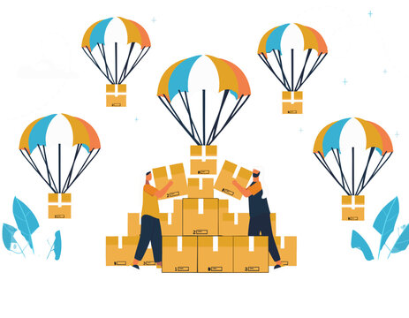 People Unloading Boxes Delivered By Parachutes At A Donation Station With Blue And Orange Accents And A Dark Background