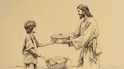 Biblical Illustration of Jesus Blessing Five Loaves and Two Fish, Feeding 5,000, Boy Provides Food, Beige Background, Copyspace