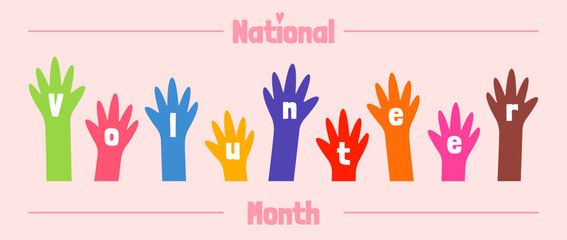 Many colorful hands and text NATIONAL VOLUNTEER MONTH on pink background