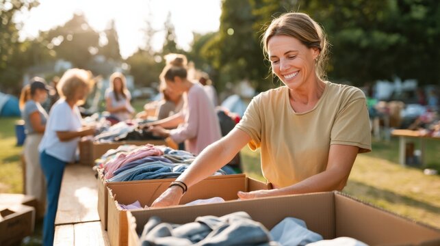 Smiling woman sorting through donated clothing at an outdoor charity event, surrounded by volunteers, showcasing community spirit and support for those in need
