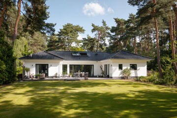 A contemporary house with a generous green lawn is nestled amidst towering pine trees, creating a peaceful atmosphere in a tranquil neighborhood on a beautiful, sunny day