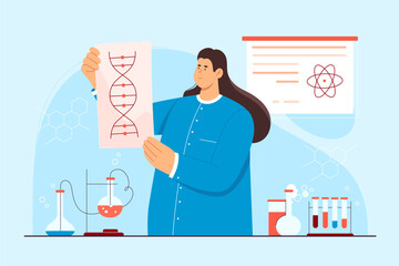 DNA laboratory research of female scientist vector illustration. Cartoon woman holding DNA helix model of sequencing genes, genetic analysis and lab experiment for innovation science development