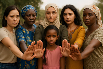 A powerful scene of six diverse women forming a protective barrier with their hands in front of a young girl, symbolizing unity, strength, and resistance against female genital mutilation.