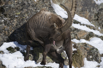 Alpine ibex (Capra ibex ibex) licking erect penis, rutting behaviour, Gran Paradiso National Park, Italy, November 2008