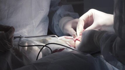 Close up detail of a surgery on male genitals with the professional equipment. Action. Surgeons in sterile suits performing medical procedure, process of prostatectomy.
