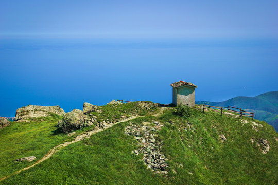 Alpine landscape with small soldiers monument facing the Mediteranean Sea in Beigua National Geopark, Liguria, Italy