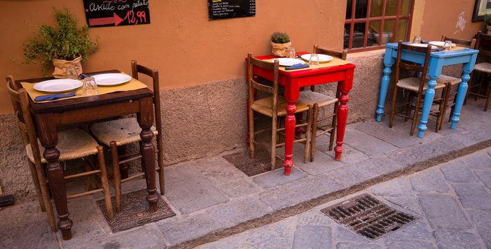 SESTRI LEVANTE, ITALY, MAY 31, 2019 - Tables set in a typical Italian outdoor restaurant in Sestri Levante, province of Genoa, Italy.
