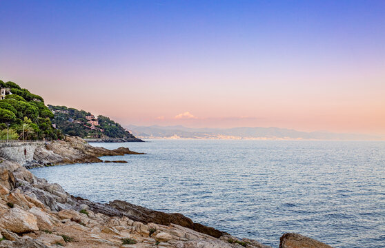 Silence bay and seaside of small resort town Sestri Levante at sunset. Genova Province, Liguria, Italy