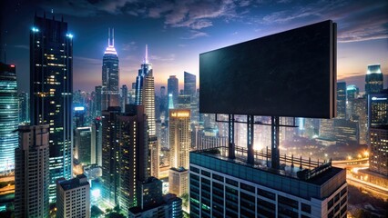 Dark urban cityscape at night with a massive black billboard standing tall amidst neon lights, skyscrapers, and bustling city streets.