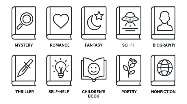 Genres of books color line icons set. Collection of all genres in literature. Pictogram for web page, mobile app, promo. UI UX GUI design element. Editable stroke.