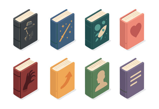 Isometric book genre icons set – mystery, fantasy, sci-fi, romance, horror, business, biography, poetry