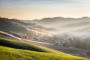 Sunrise light in the mist on gentle hills in the countryside, Emilia Romagna, Italy