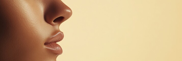 Extreme close up of female face with highlighted cheekbone, smooth glowing skin, natural makeup, soft lips, and defined eye, showing healthy radiant complexion