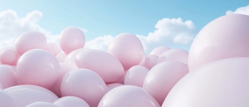 Serene coastal scene featuring a collection of seashells and pearls on sandy beach with gentle waves and soft clouds in a pastel color palette