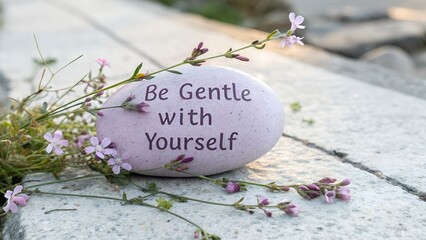 Gentle Reminder: A smooth, round river rock rests upon a path, a delicate pink flower cluster beside it. Its soft surface is inscribed with a gentle reminder, "Be Gentle with Yourself.