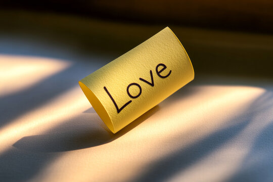 A yellow paper curled into a soft arc displays the word "Love" under gentle natural lighting.
