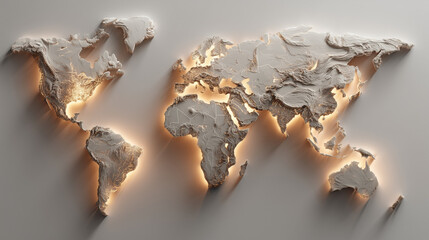 Minimalist world map with glowing backlight relief effect on neutral background ideal for travel websites, educational materials and global data presentations