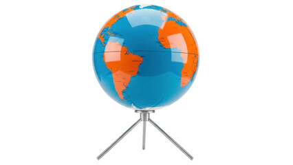 Blue and orange globe isolated PNG, world map on stand for geography education and travel planning, on transparent background