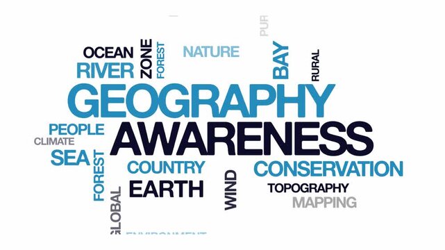 Geography Awareness concept Animated Tag Word Cloud kinetic typography, Text Design Animation typography seamless loop video motion graphics Intro, Word Art Looping 4k blue type on black background bg