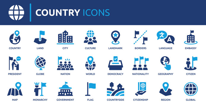 Country icon set. Containing flag, nation, citizen, land, world, government, landmark, borders and more. Solid vector icons collection.